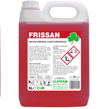 Een zuurvrije reiniger voor toilet en wasruimte. Reinigt en zorgt voor een lange aangename geur Dikvloeibare rode vloeistof met een langhoudende geur. Frissan bestaat uit surfactanten en emulgatoren die lichaamsvetten en schuim oplossen. Frissan kan veilig worden gebruikt voor het reinigen en opfrissen van alle wasoppervlakken, zoals lavabo's, kranen, baden, accessoires, apparatuur, muren, deuren, betegelde of keramische vloeren, toiletten, bidets en urinoirs. GEBRUIKSAANWIJZING Frissan kan onverdund worden gebruikt of in oplossingen tot 2%. Bij onverdund gebruik reinigt u het oppervlak met Frissan en vervolgens spoelt u het product weg. Bij verdund gebruik wrijft u het oppervlak na, waarbij u de vloeistof zoveel mogelijk opneemt, zodat het oppervlak snel en streepvrij opdroogt.